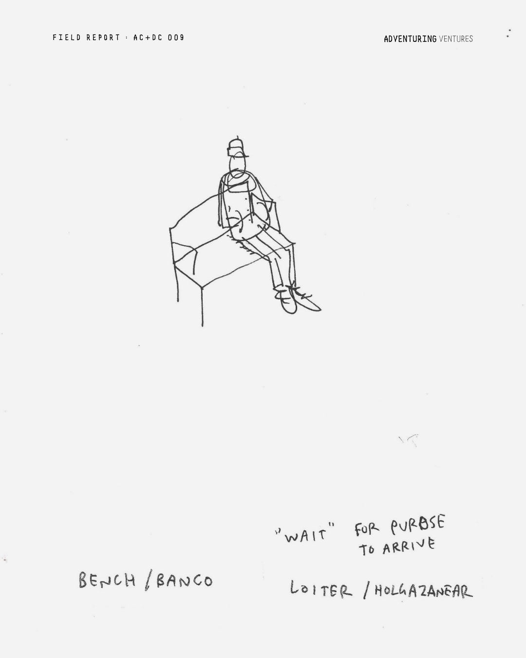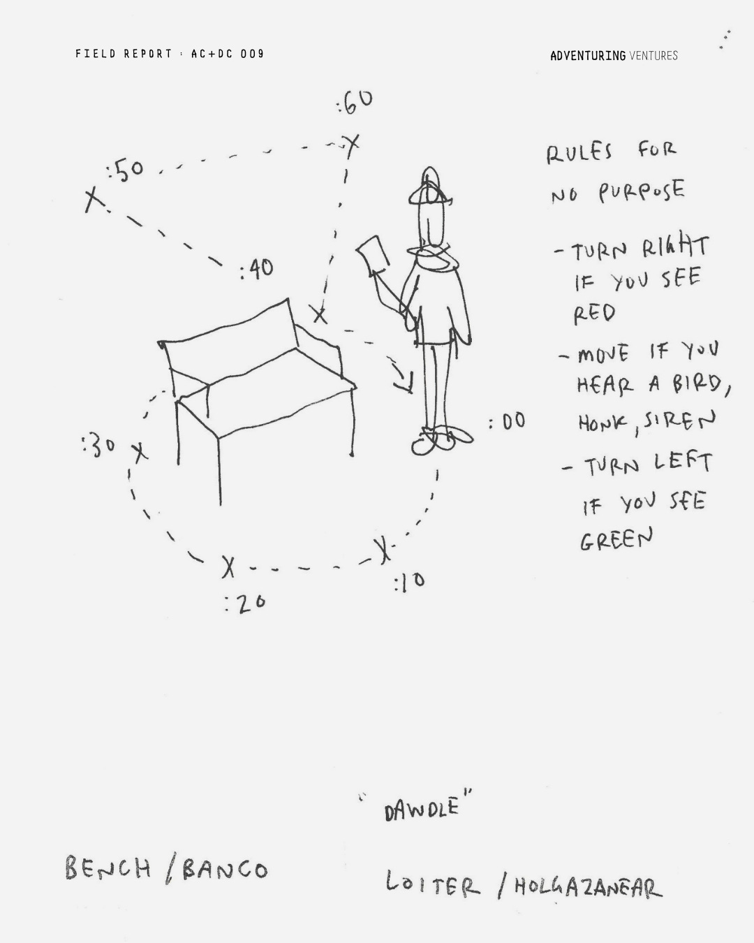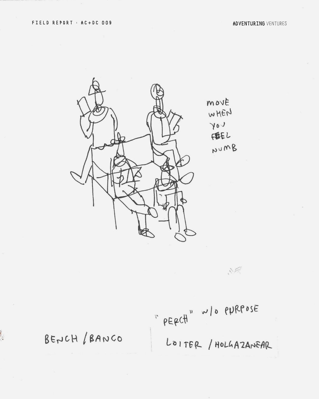En mi barrio hay muchos bancos. En las plazas, a lo largo de las calles. Hice una búsqueda rápida sobre la definición de «merodear» para encontrar algo de inspiración. Luego hice algunas copias y me obligué a pensar en cuatro ideas. Vea los resultados a continuación. Al principio, me quedé bloqueado, pero después de ampliar el significado de «merodear», me inspiró la idea de no tener ningún propósito. ¿Cómo podría diseñar intencionadamente un momento sin propósito?