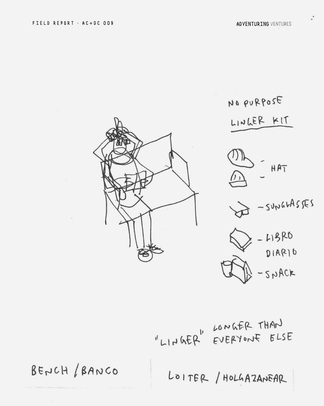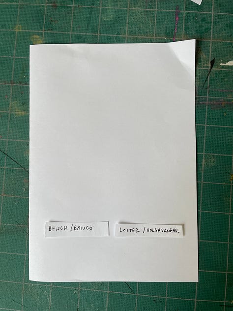 We have many benches in my neighborhood. In the plazas, along streets. I did a quick search on the definition of “loiter” to find some inspiration. I then made some copies and forced myself to come up with four ideas. See results below. At first, I was stuck but after expanding what “loiter” could mean, I got inspired by the idea of having no purpose. How could I intentionally design a moment without a purpose?