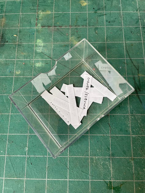 Select a piece of paper from each list. See photos below. I held the box above my head, closed by eyes, and picked a piece of paper. / Selecciona un papel de cada lista. Mira las fotos de abajo. Sostuve la caja sobre mi cabeza, cerré los ojos y elegí un papel.